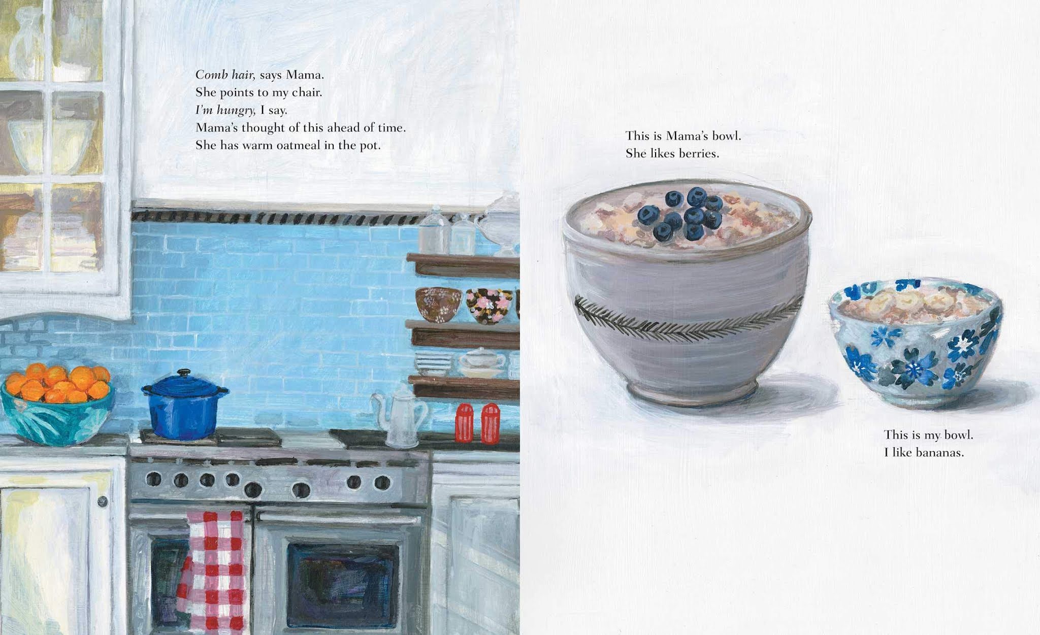 Mama’s bigger bowl of oatmeal, and comments that Mama likes berries while she